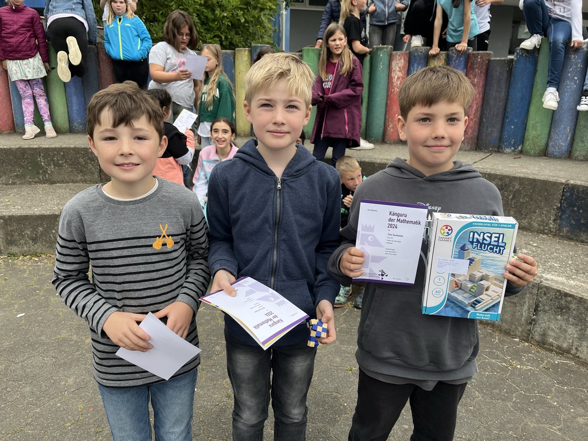 Als Dankeschön für die Teilnahme haben alle Schüler und Schülerinnen am 14. Juni sowohl eine Urkunde mit den individuell erreichten Punkten, eine Broschüre „Mathe mit dem Känguru – inkl. Lösungen“, als auch ein Knobelspiel „Knotenpuzzle“ erhalten. Die „Sprungleistung“, die zum längsten Kängurusprung führt (sprich: Anzahl der direkt hintereinander richtig gelösten Aufgaben), wird jährlich mit einem Känguru-T-Shirt prämiert. Luca Finn aus der 4P1 hat dieses Jahr den größten Kängurusprung an unserer Schule geschafft – 12 richtige Antworten hintereinander! Für besondere Leistungen werden auch landesweite Zusatzpreise vergeben: Timur Kusewanow aus der 3P3 hat mit 80,50 Punkten einen solchen landesweiten 2. Preis erhalten.