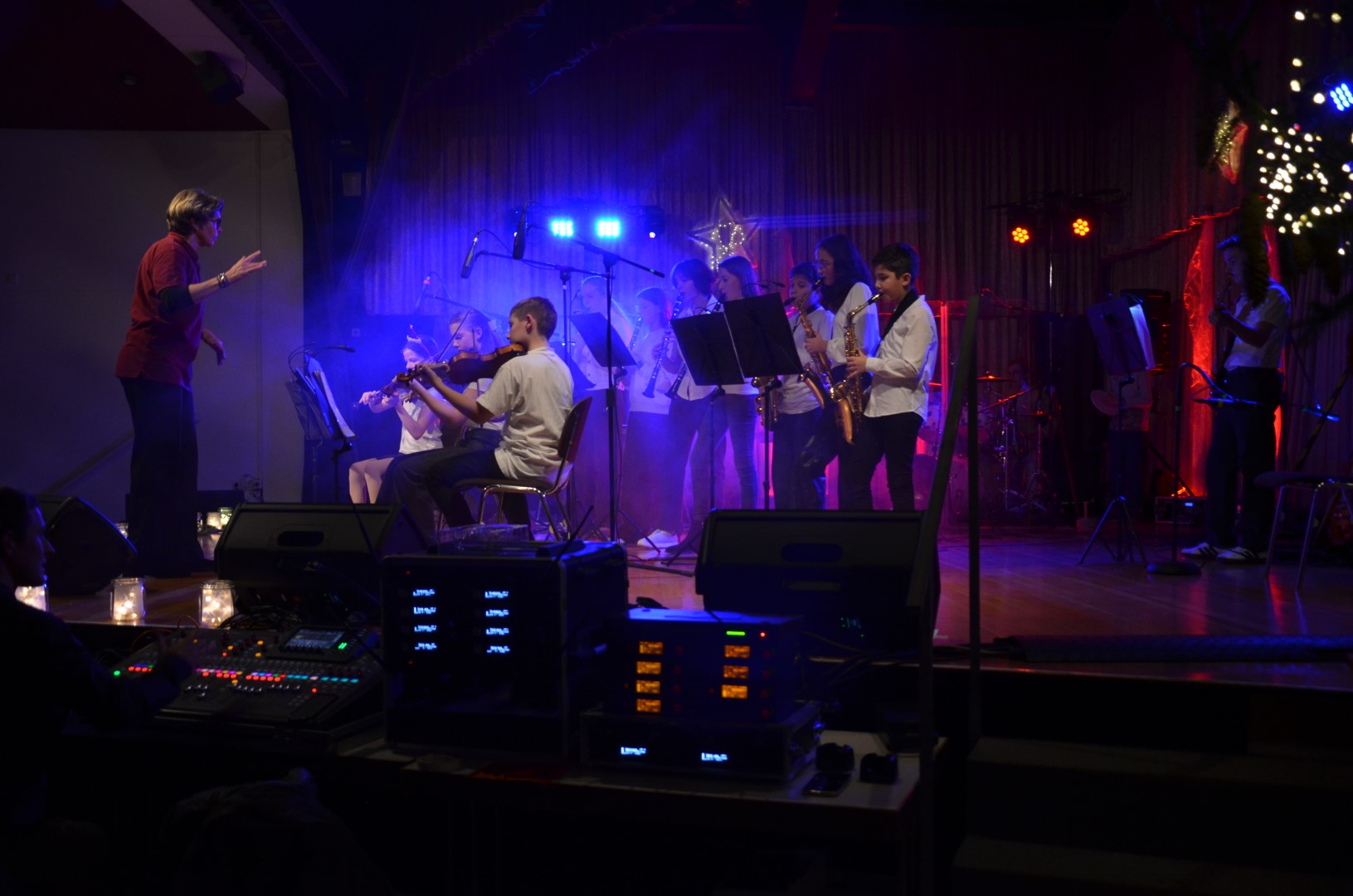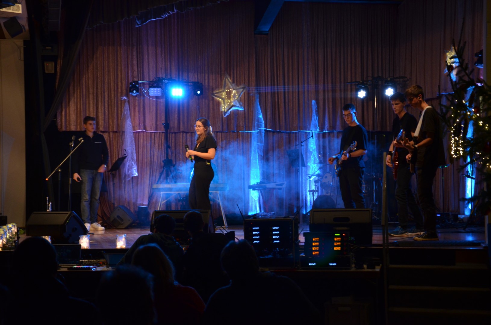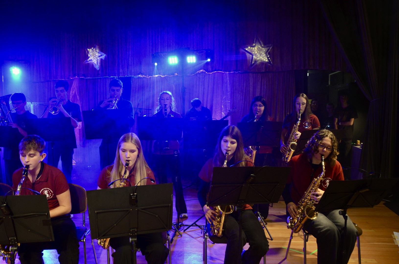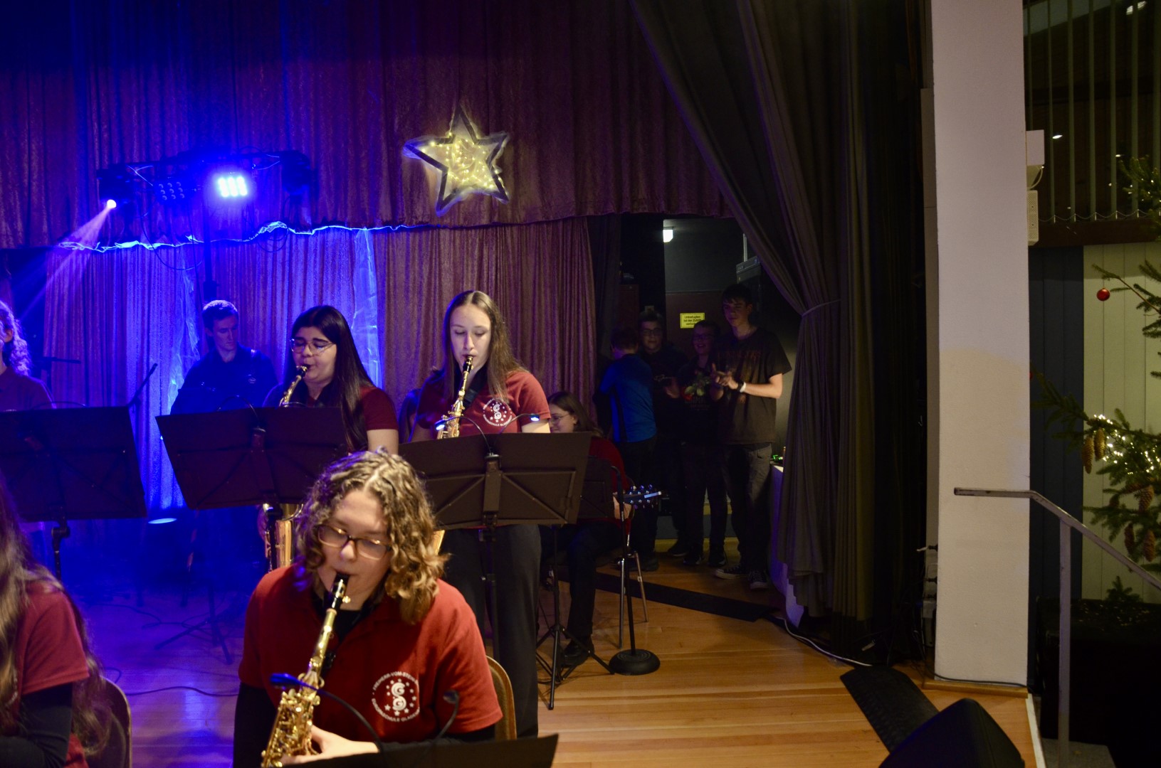 Drei Bands traten im Anschluss auf und sorgten für eine musikalische Reise durch verschiedene Genres. Die Juniorband, geleitet von Christina Guhl, begann u.a. sanft mit „Jingle Bells“ und „O Come All Ye Faithful“, gefolgt von der Schülerband, die ihren ersten, aber sicherlich nicht letzten Auftritt meisterte. Mit einer kraftvollen Interpretation des „Little Drummer Boy“ und Shakin’ Stevens‘ „Merry Christmas Everyone“ animierten die Schülerin und die Schüler der Oberstufe das Publikum zum Mitsingen und heizten mit dem energiegeladenen „Narcotic“ von „Liquido“ den Saal ein.