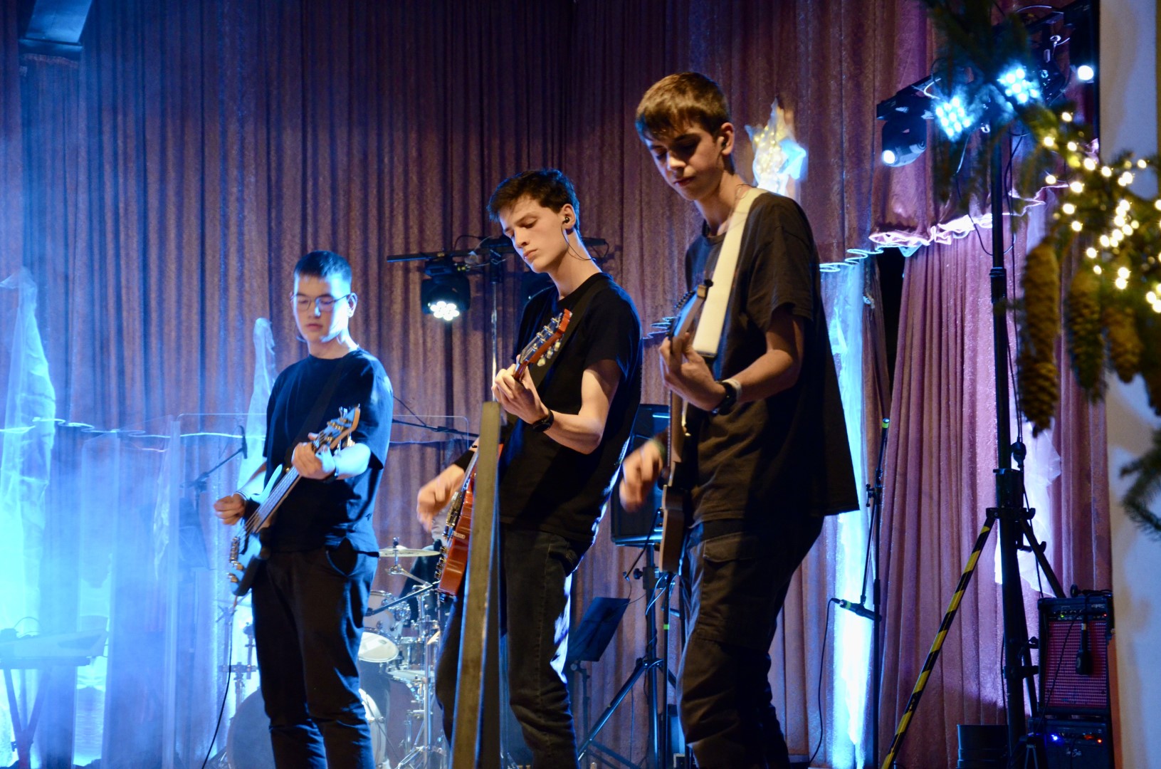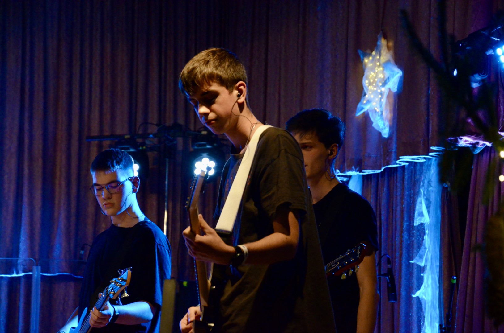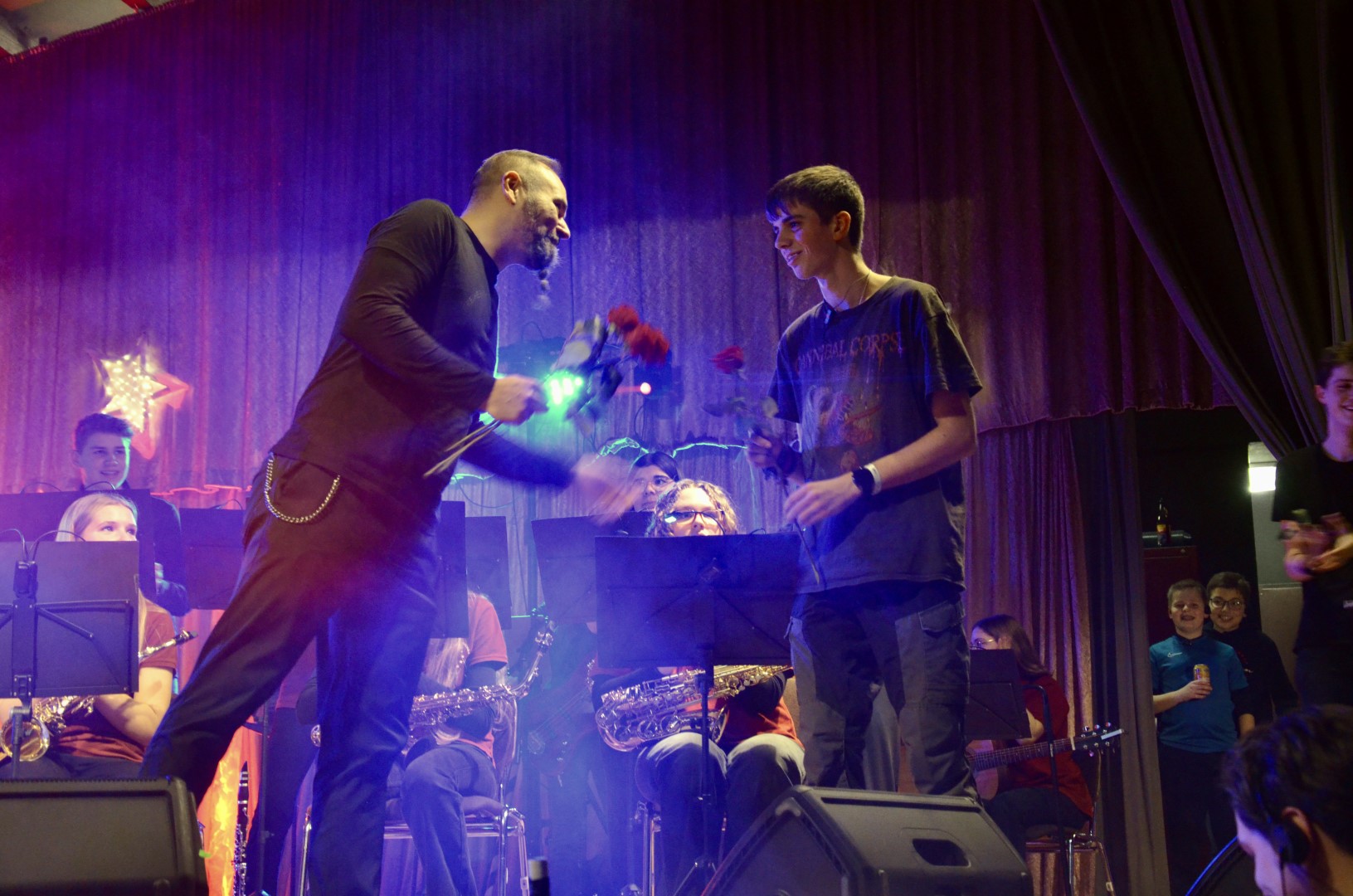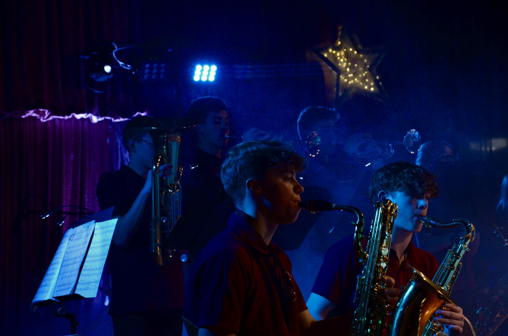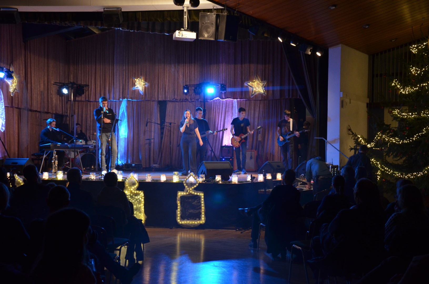 Drei Bands traten im Anschluss auf und sorgten für eine musikalische Reise durch verschiedene Genres. Die Juniorband, geleitet von Christina Guhl, begann u.a. sanft mit „Jingle Bells“ und „O Come All Ye Faithful“, gefolgt von der Schülerband, die ihren ersten, aber sicherlich nicht letzten Auftritt meisterte. Mit einer kraftvollen Interpretation des „Little Drummer Boy“ und Shakin’ Stevens‘ „Merry Christmas Everyone“ animierten die Schülerin und die Schüler der Oberstufe das Publikum zum Mitsingen und heizten mit dem energiegeladenen „Narcotic“ von „Liquido“ den Saal ein.